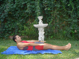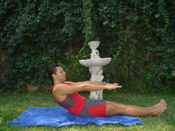 Inhala y eleva los brazos hasta que tus codos lleguen a la altura de tus hombros y al exhalar contrae el abdomen y vez bajando poco a poco sintiendo como tu espalda se convertirá en un collar de perlas apoyando cada perla (vértebras de la columna vertebral) en el suelo, tocando primero la zona lumbar, después la dorsal y por ultimo la zona cervical.